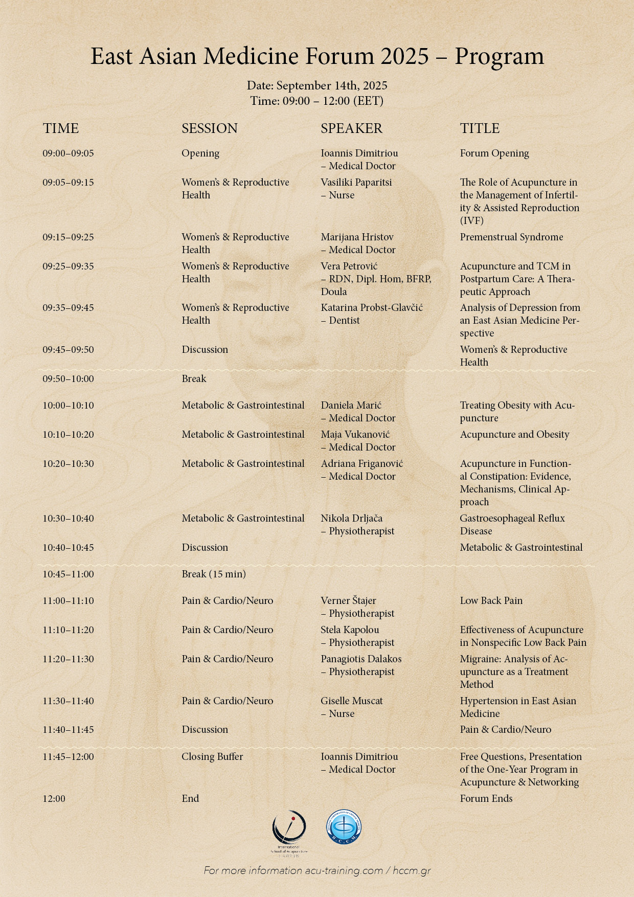 The International School of Acupuncture, in collaboration with the Hellenic Corporation of Chinese Medicine, is organising the well-established East Asian Medicine Forum, dedicated exclusively to acupuncture.
